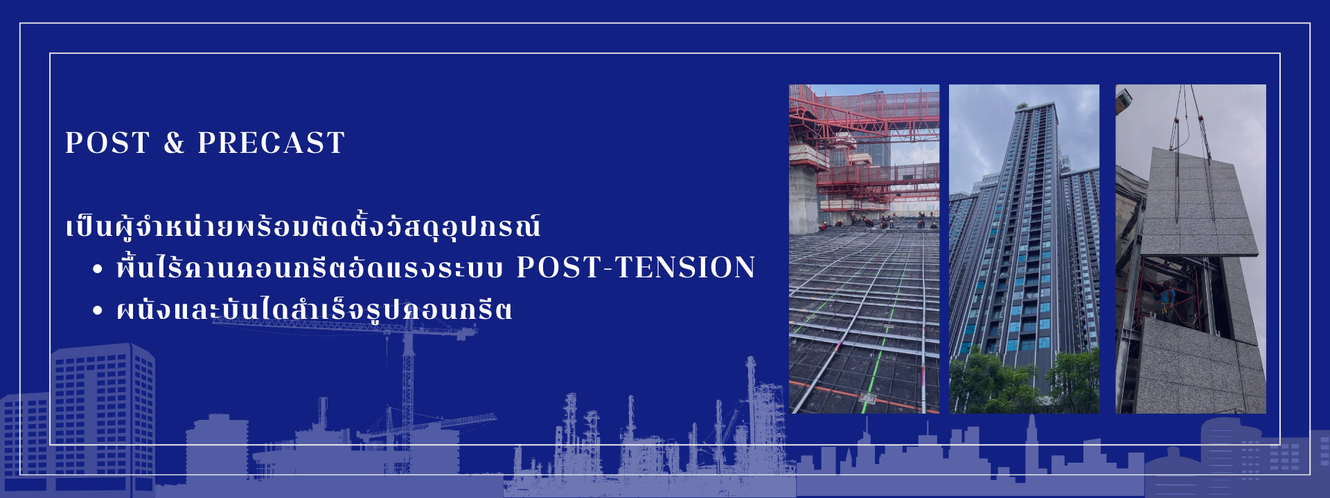 Post & Precast Co.,Ltd. เป็นผู้เชี่ยวชาญในงานพื้น Post – Tensioned Slab และ งาน Precast Concrete บริษัทฯได้นำเทคโนโลยี และวิวัฒนาการที่ทันสมัยมาผสมผสานกับคุณภาพของวัสดุที่คุณภาพสูง และการผลิตโดยทีมงานที่มีความเชี่ยวชาญโดยเฉพาะ ประกอบกับประสบการณ์โดยตรงมากกว่า 22 ปี และได้รับรองระบบบริหารคุณภาพตามมาตรฐานเลขที่ มอก. 9001-2559 (ISO 9001 : 2015)