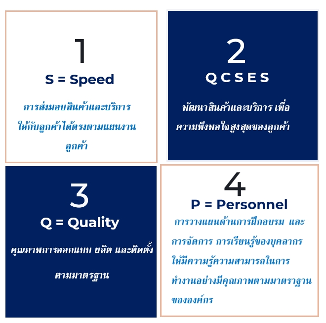 นโยบายคุณภาพของบริษัท : บริษัทมุ่งมั่นพัฒนาผลิตสินค้าที่มีคุณภาพตามความต้องการของลูกค้าอย่างต่อเนื่องรวมถึงการให้บริการเพื่อความพึงพอใจสูงสุดของลูกค้า เราเชื่อว่าความรับผิดชอบอันดับแรกของเรา คือ ความรับผิดชอบต่อลูกค้าของเรา รวมถึงคนที่เข้ามาใช้ผลิตภัณฑ์หรือบริการของเรา เพื่อตอบสนองความต้องการของลูกค้า ทุกสิ่งที่เราทำจะต้องมีคุณภาพสูง(Q) แต่ก็ยังต้องพยายามลดต้นทุน เพื่อรักษาระดับราคาให้สมเหตุสมผล(C) อีกทั้งคำสั่งซื้อของลูกค้าจะต้องได้รับการบริการอย่างรวดเร็ว(S) และคำนึงถึงมาตรฐานด้านความปลอดภัย (S) และการใส่ใจต่อสิ่งแวดล้อม(E) เพื่อให้ลูกค้าและผู้ใช้บริการได้รับความพึงพอใจสูงสุด