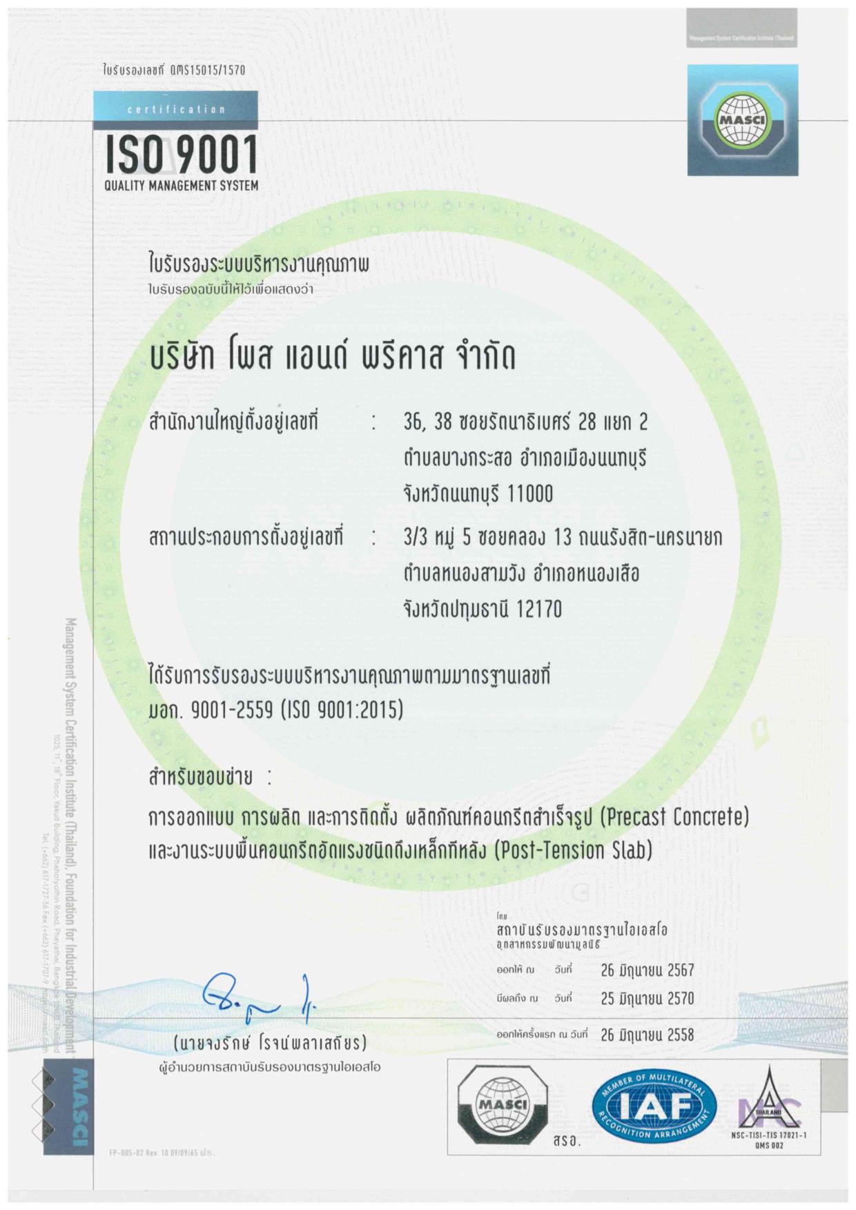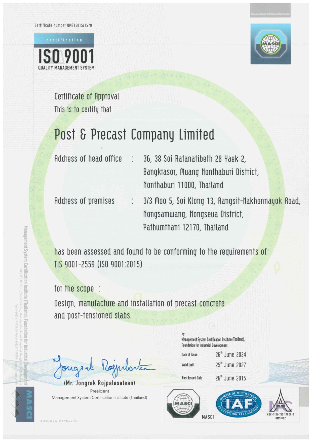 Post & Precast Co.,Ltd. เป็นผู้เชี่ยวชาญในงานพื้น Post – Tensioned Slab และ งาน Precast Concrete บริษัทฯได้นำเทคโนโลยี และวิวัฒนาการที่ทันสมัยมาผสมผสานกับคุณภาพของวัสดุที่คุณภาพสูง และการผลิตโดยทีมงานที่มีความเชี่ยวชาญโดยเฉพาะ ประกอบกับประสบการณ์โดยตรงมากกว่า 22 ปี และได้รับรองระบบบริหารคุณภาพตามมาตรฐานเลขที่ มอก. 9001-2559 (ISO 9001 : 2015)